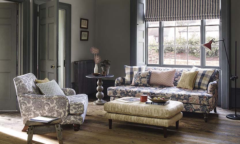 Kollektion von Stoffen in englischen Landhausstil. Jacquards, vintage blumen, Chenille Ebene, Streifen und Karos. Die perfekte Wahl für eine moderne, ländliche Atmosphäre dieses vielseitige Stoffe eignen sich für Vorhänge und Polster.