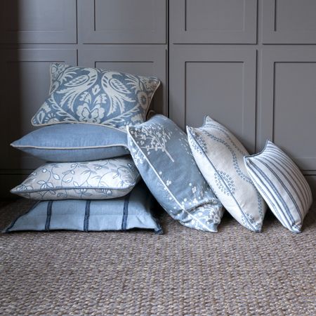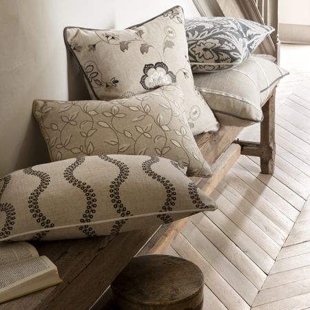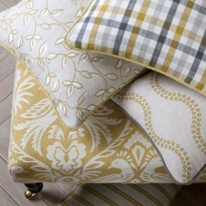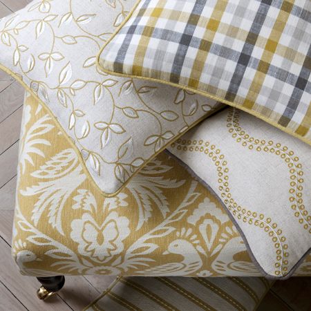 Eine klassische Kollektion mit einer Mischung aus gestickten Mustern auf Leinen, fein gewobenen karierte und Jacquards strukturierte Vorhänge und Polster, sowie Leinen-Look Möbelstoff in Uni-Farben. Die kalkhaltigen Palette verschiedenen Designs verwendet, unter anderem. shades of sand, acacia, chambray and duck egg.