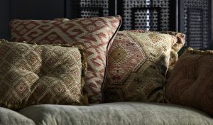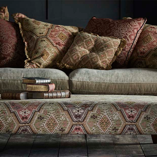 Kollektion schwerer Polsterstoffe mit orientalischem Design. Die Stoffe haben eine Abriebfestigkeit von 20.000 Martindale. Die Farben und Muster lassen sich gut kombinieren.