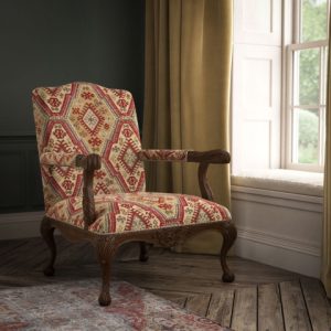 Polsterung in schwerer Qualität mit weichen Chenillegarnen. Der Stoff hat ein authentisches Kelimmuster. Abriebfestigkeit 20.000 Martindale. Breite 140 cm.