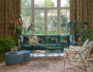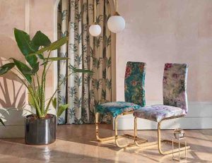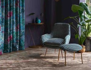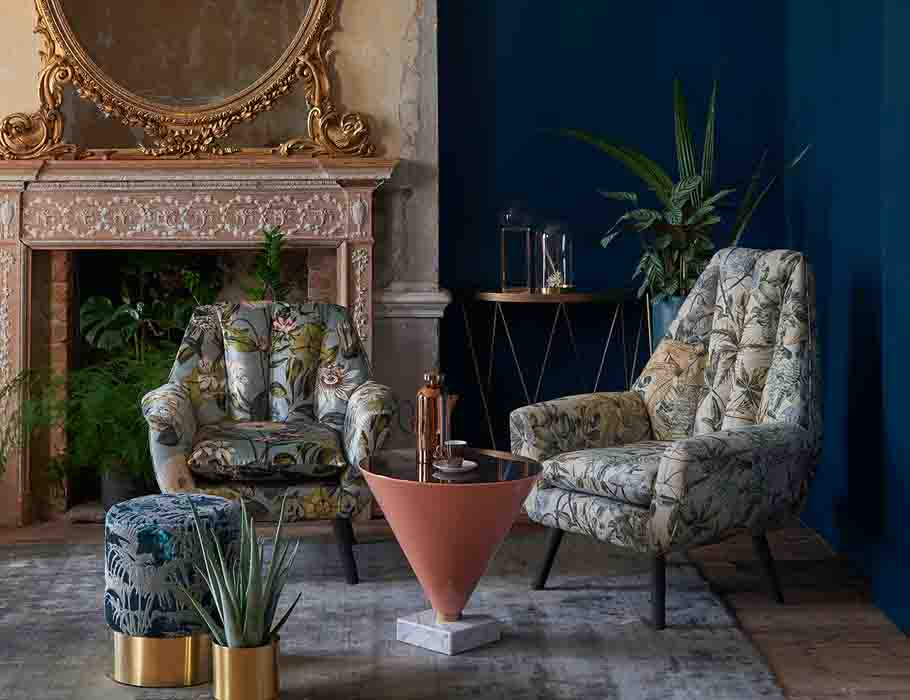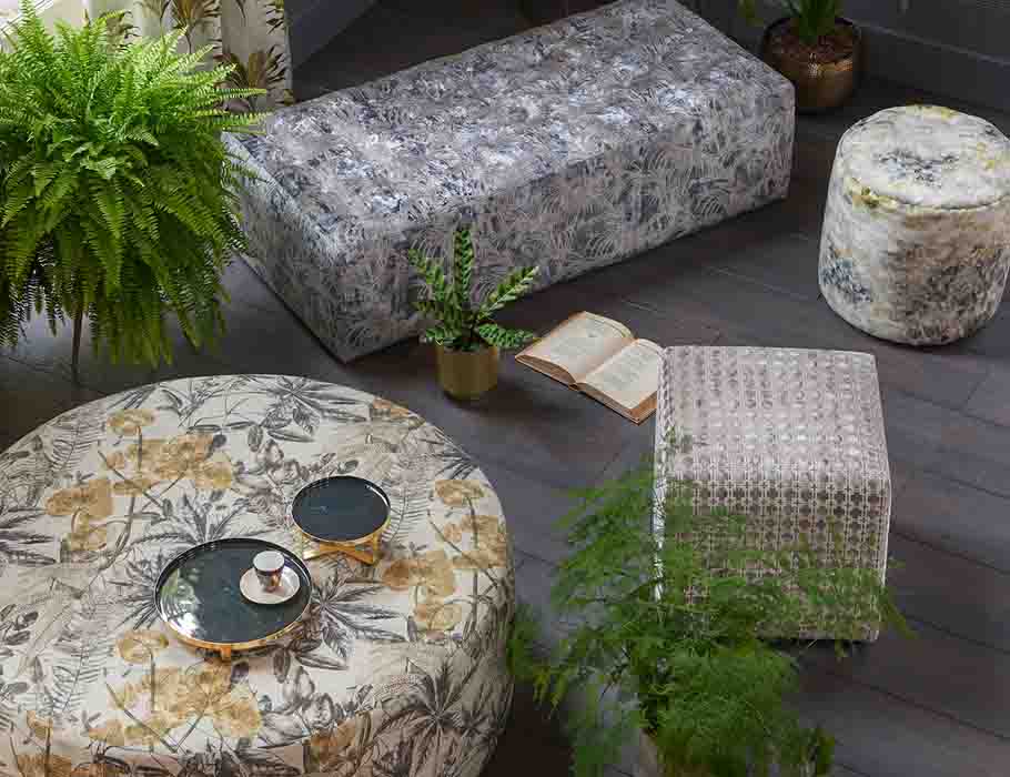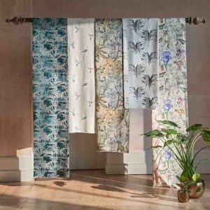 Paradiesvögel, Passionsblumen und ein exotisches Inselleben glänzen vor opulentem Samt, rustikaler Bettwäsche, Stickereien und komplizierten Geweben. Die 45-Farben reichen von Eisvogel-Tönen bis hin zu lebendigen Krickenten und weichen Kombinationen aus Schiefer, Amethyst-Mineral und Rouge. Diese atemberaubende Kollektion ist eine verführerische Hommage an das tropische Inselleben.