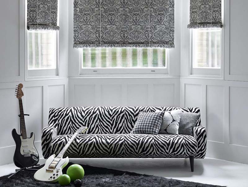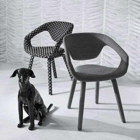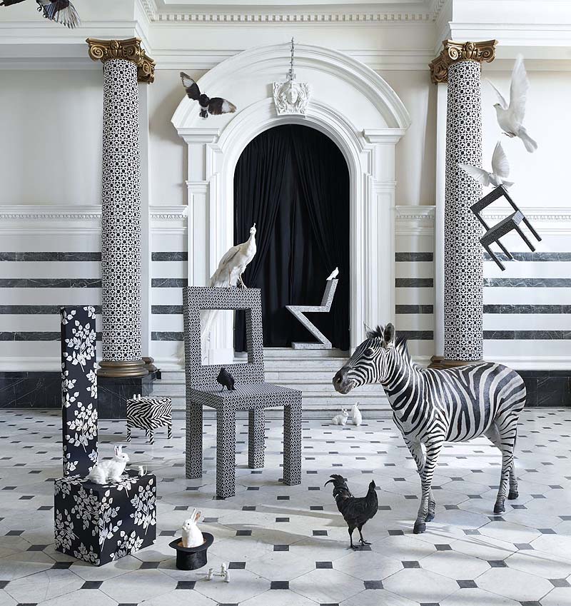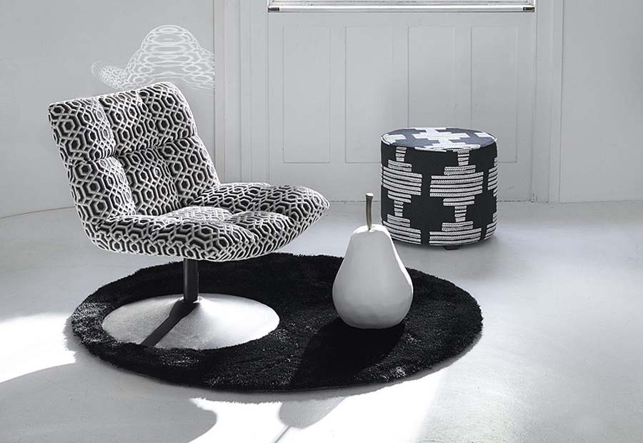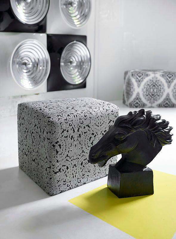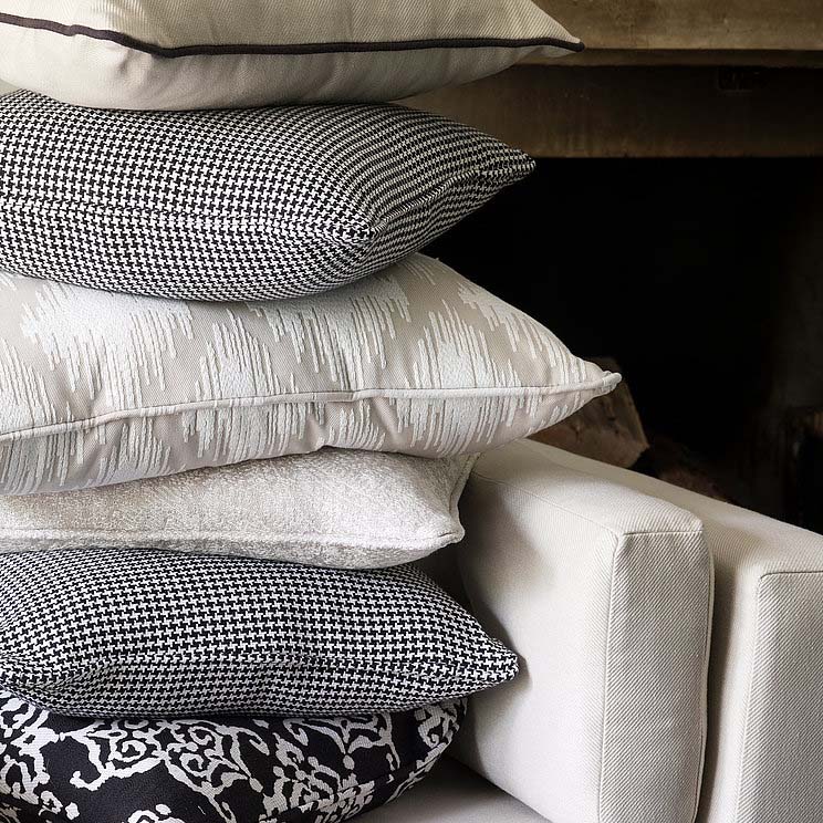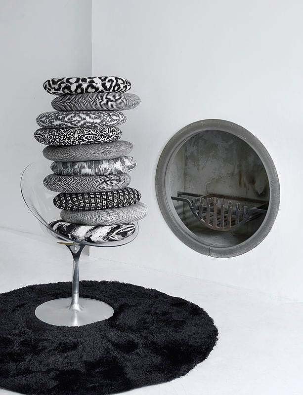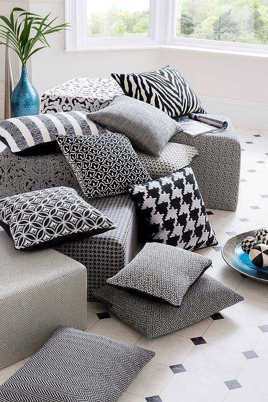 Eine Sammlung von Polsterung in Schwarz / Weiß-Farben. Von Samt Stickereien, die essentiellen Ebenen und eine Vielzahl von Mustern, die alle sorgfältig zusammengesetzt sind.