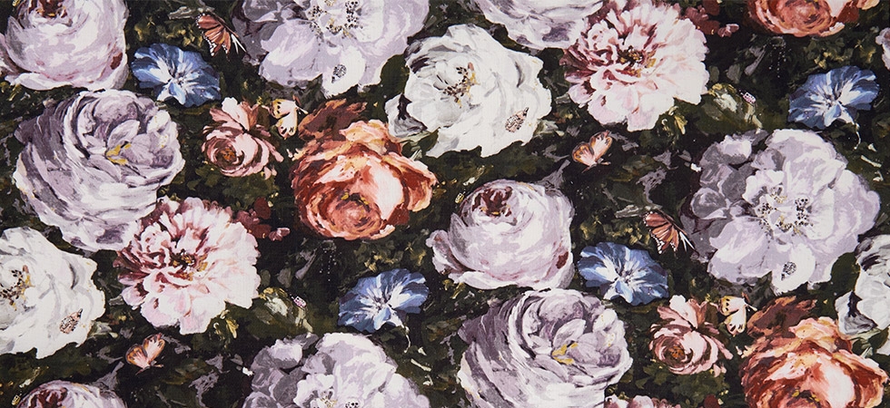 Schöner gewebter Möbelstoff mit großem Blumenmuster. Abriebfestigkeit 35.000 Martindale. Breite 137 cm.