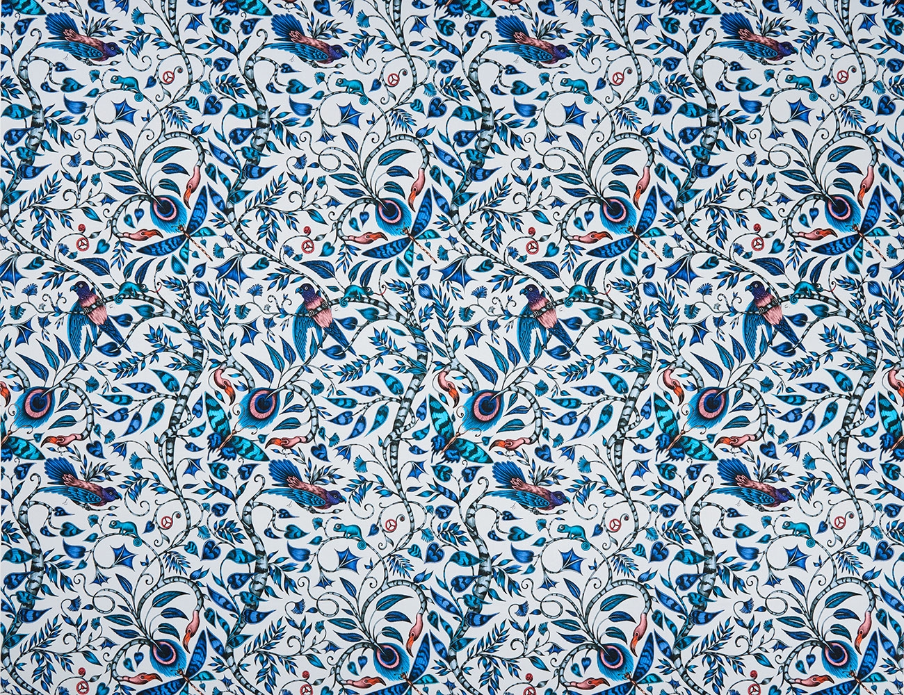 Weich glänzender, satinartiger Möbelstoff mit einem wunderschönen Muster der Künstlerin Emma J Shipley. Dieses Stoff weist eine Abriebfestigkeit von 30.000 Martindale. Geeignet für Möbelpolster, Vorhänge und Dekoration.