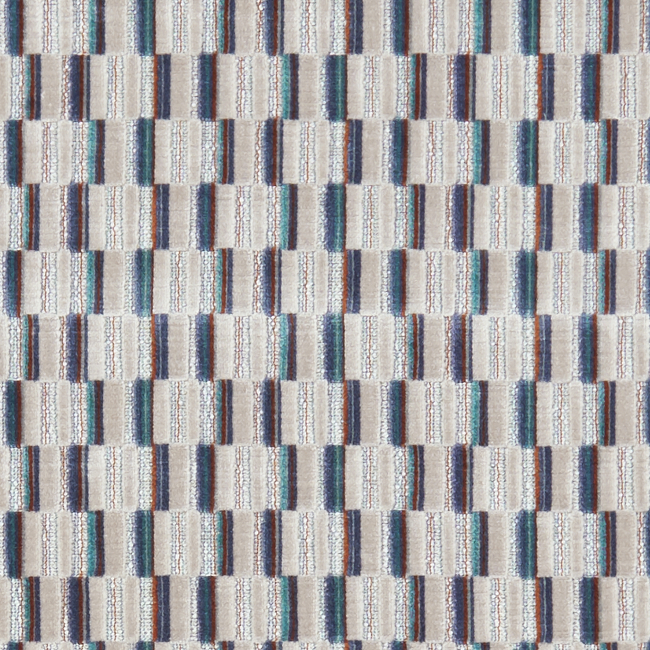 Luxuriöser Samtbezug mit geometrischem Muster. Abriebfestigkeit 50.000 Martindale. 137 cm breit.