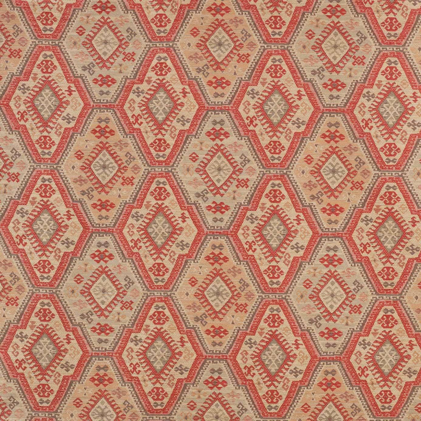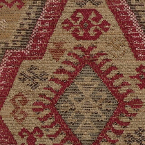 Polsterung in schwerer Qualität mit weichen Chenillegarnen. Der Stoff hat ein authentisches Kelimmuster. Abriebfestigkeit 20.000 Martindale. Breite 140 cm.