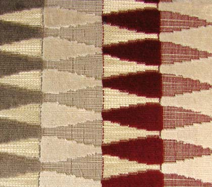 Moderner Möbelstoff mit schönem Grafikdesign. Der Stoff hat eine feine Struktur und überlagerte Veloursmuster. Abriebfestigkeit 25.000 Martindale. 140 cm breit.