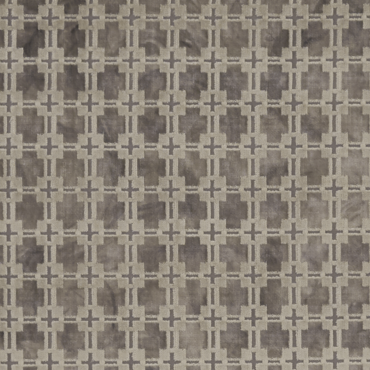 Schwer Samtpolsterung und Vorhangstoff. Der Stoff hat ein kleines geometrisches Muster. Leicht glänzend. Abriebfestigkeit 50.000 Martindale. 138 cm breit.